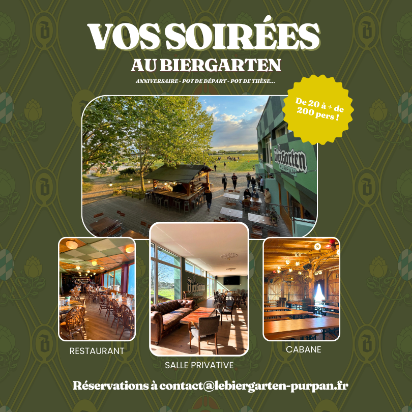 Le Biergarten Purpan, c’est un endroit hors du commun : 10000m2 d’espace extérieur, une brasserie traditionnelle le midi et d’inspiration bavaroise le soir, des espaces privatifs, des jeux pour petits et grands mais, c’est surtout un espace pensé pour tous, qui vous accueille toute l’année !