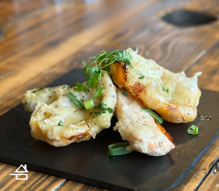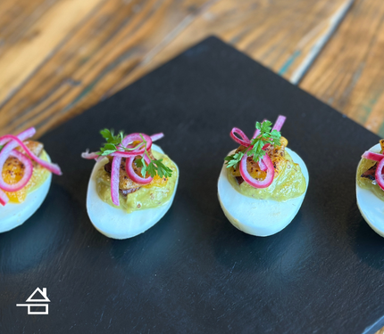 à l'unité1 demi oeuf mimosa à l'huile de poireaux, bacon grillé, cheddar, oignons pickles. - Fait maison