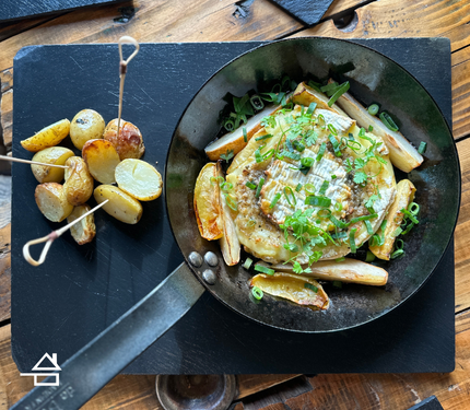 Poêlon de camembert rôti aux amandes, origan, ail. Accompagné de pommes de terre grenaille, pommes, poires et abricots - Fait maison.