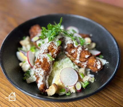 Mesclun, vinaigrette au miel, croquettes de chèvre, tomate confite, oignon frit, tuile de pain.