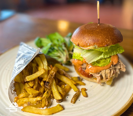Buns bretzel, effiloché de porc, saucisse fumée, Morbier, salade, compotée d'oignons, sauce burger, frites