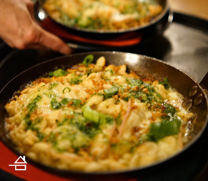 Spätzle, Morbier, Beaufort, chapelure de malt, huile persillée.