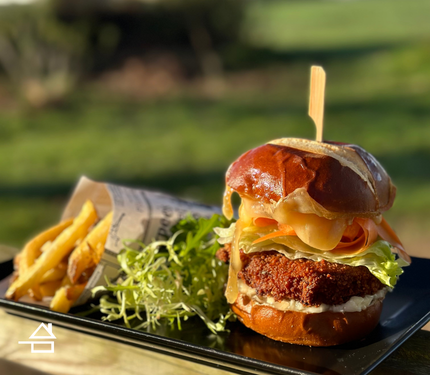 Buns Bretzel, galette de légumes, salade, tagliatelles de carotte, aïoli, morbier, confit d'oignons, frites
